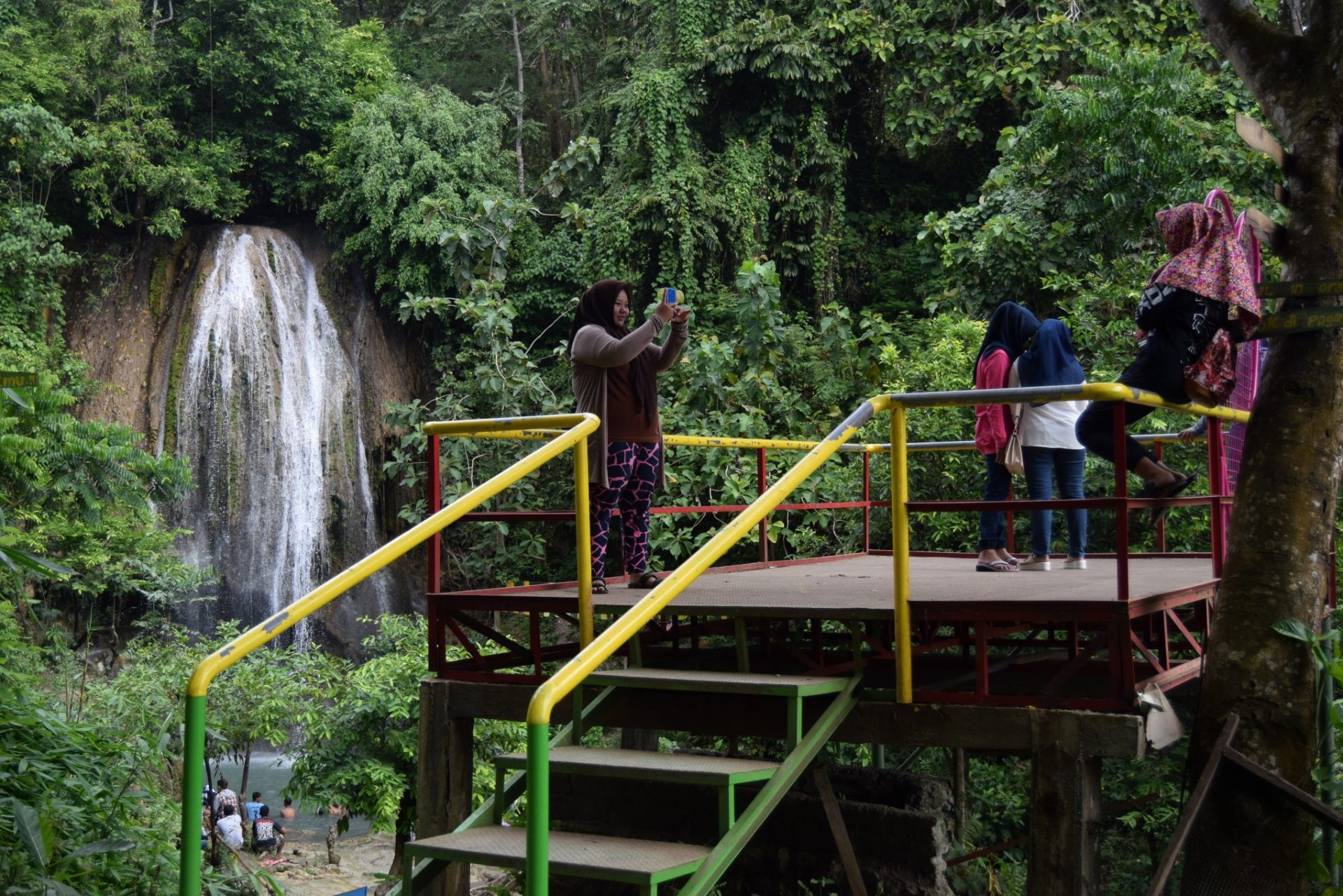Air terjun di sana tidak begitu tinggi. Mereka yang datang ke sana, relatif aman untuk mandi baik di sungai yang mengalir dari air terjun. Di sebelah air terjun juga terdapat aliran sungai berair jernih, cocok untuk bermain anak-anak.